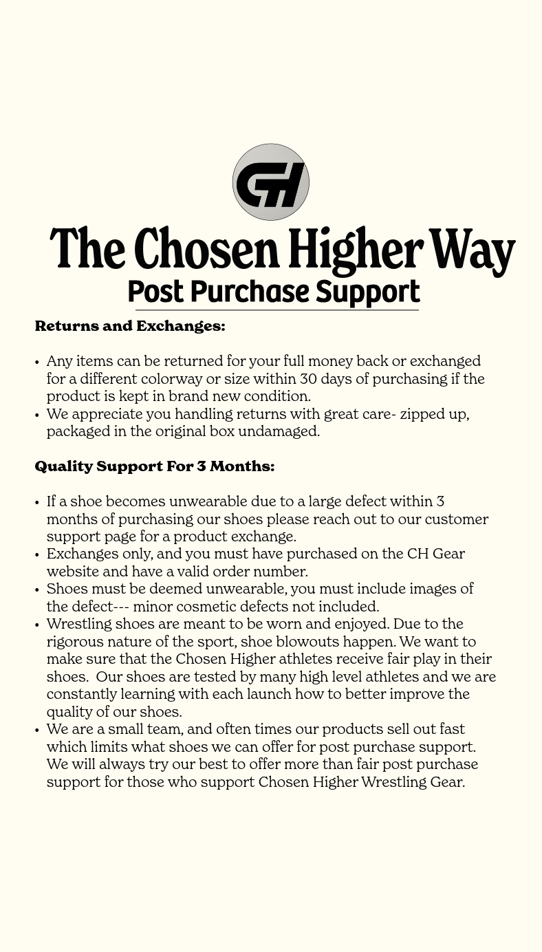 Any shoes non-wrestled in can be returned within 30 days of purchase for a full refund or exchange. If you are wishing to exchange please label your message " Hi my name is "FULL NAME" and my order number is "ORDER NUMBER". I would like to return or exchange my "insert products" for "exchange product".